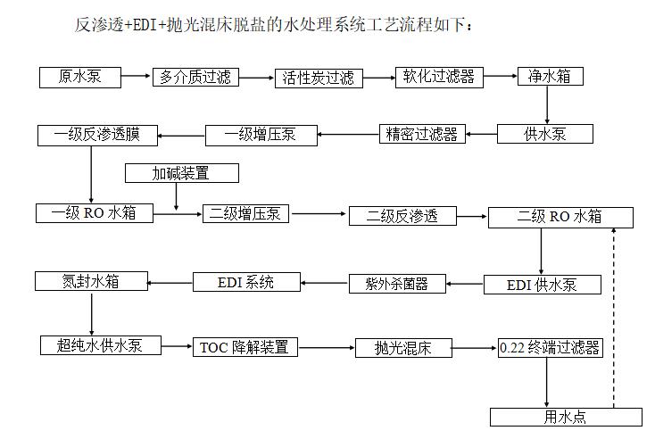為保證關(guān)鍵設(shè)備反滲透裝置的長期可靠穩(wěn)定運行,則必須設(shè)置預處理系統(tǒng),滿足反滲透膜(RO)進水指標:濁度<0.5NTU、SDI<4、余氯<0.1ppm。根據(jù)原水水質(zhì),預處理系統(tǒng)由多介質(zhì)過濾器、活性炭過濾器、加藥系統(tǒng)及相關(guān)輔助設(shè)備組成。 反滲透+EDI+拋光混床脫鹽的水處理系統(tǒng)工藝流程如下: |